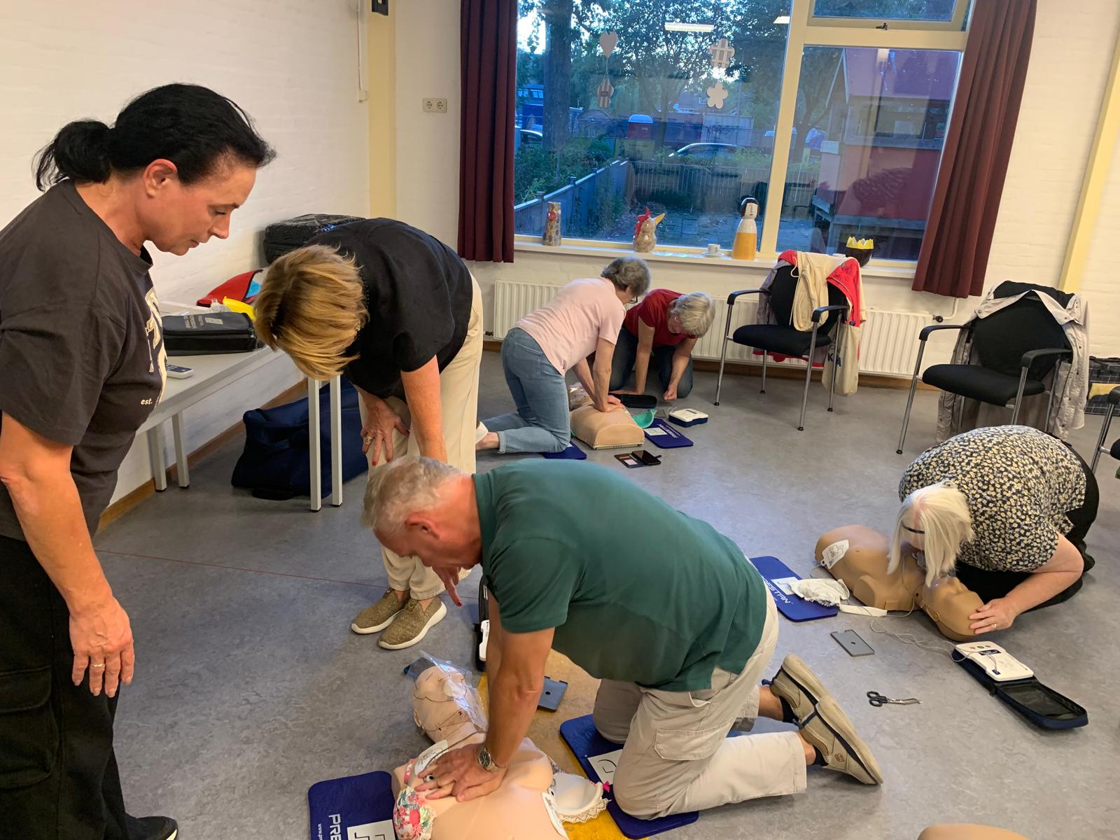 De avonden startten met een korte uitleg over wat er in het lichaam gebeurt bij een hartstilstand en waarom snelle hulp zo belangrijk is, voor een grotere kans op overleving. Daarna gingen ze praktisch aan de slag. In kleine groepjes oefenden ze borstcompressies, veilige beademingstechnieken en het gebruik van de AED. Dat bleek intensief werk. Het ritme en de juiste diepte van de compressies vasthouden was een flinke inspanning, was de ervaring van de meeste cursisten.